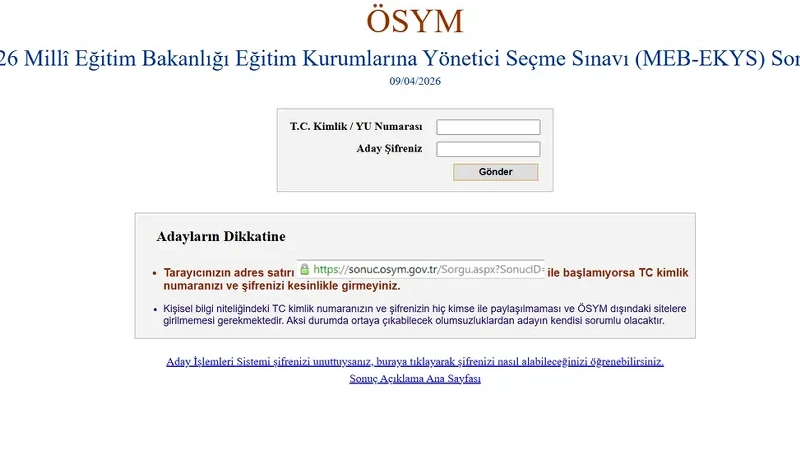 Milli Eğitim Bakanlığı Eğitim Kurumlarına Yönetici Seçme Sınavı sonuçlarının açıklanacağı tarih belli oldu. Buna göre 15 Mart Pazar günü yapılan EKYS sınav sonuçları 09 Nisan 2026 tarihinden itibaren öğrenebilecek.